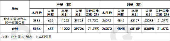 7月9日,北汽蓝谷发布6月产销快报,2019年6月,其子公司北汽新能源产量为5986辆,同比增长813.89%,销量为26072辆,同比增长483.12%;1-6月,北汽新能源累计产量11222辆,同比下滑71.75%,累计销量为65159辆,同比增长21.57%。