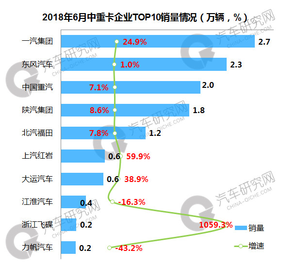 6月份一汽集团中重卡销量保持领先 同比增长24.9%