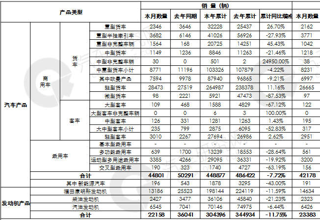 11月8日,北汽福田发布2018年10月份产销数据快报,数据显示1-10月汽车累计销量448877辆,同比下降7.72%;累计产量448746辆,同比下降7.39%。其中,货车累计销量374234辆,同比下降4.95%;客车累计销量30569辆,同比下降7.59%;乘用车累计销量44074辆,同比下降26.06%。 [详细]