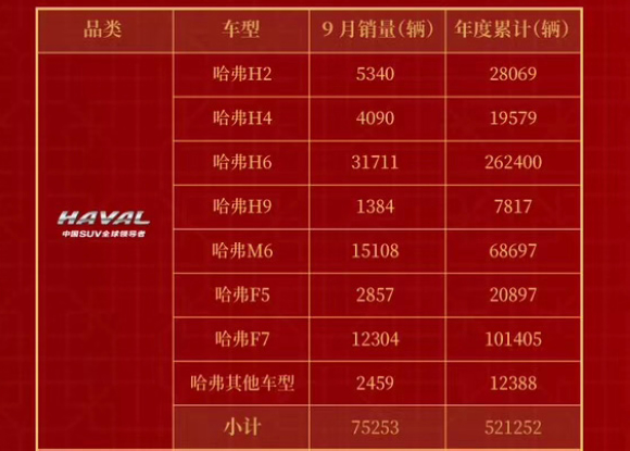 近日,哈弗SUV最新销量数据公布,全线产品持续飘红态势,9月品牌总销量高达75,253辆,相比8月逆势劲增49.7%,同比提升22.14%。至此,在前三季度中,哈弗品牌累计销量已突破52万,同比增长11.58%,呈现快速增长趋势。