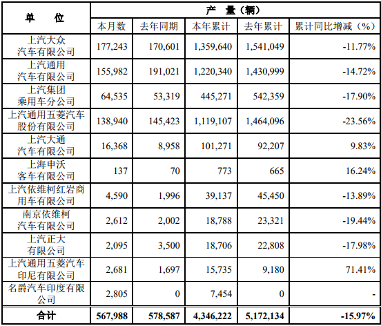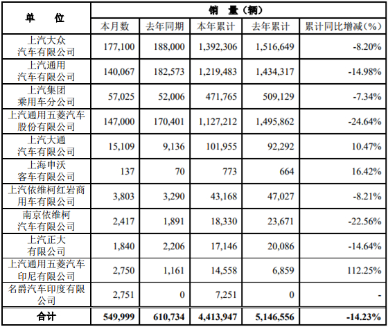 上汽集团11月销售车辆58.19万辆 累计同比下降13.33%
