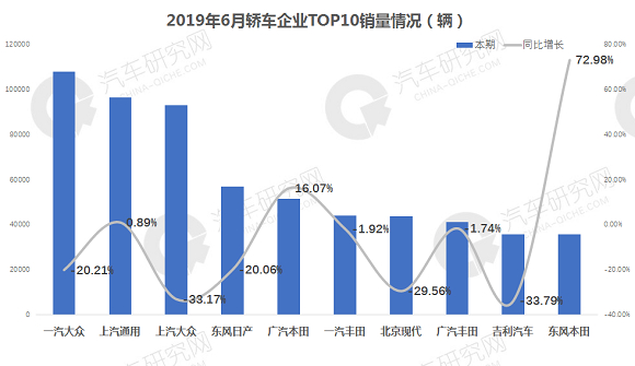 从轿车前十企业销量来看:一汽大众销量超10万辆,居首位;上汽通用、上汽大众分列二、三位,销量均在9万辆以上,同比分别为0.89%和-33.17%。东风本田销量增幅最大,同比为72.98%销量为3.56万辆排名第十;吉利降幅最高为-33.79%。