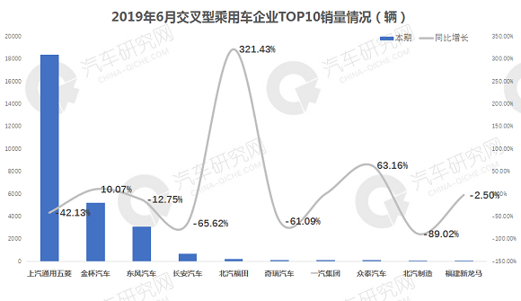 从交叉型乘用车前十企业销量来看:上汽通用五菱以1.84万辆的成绩遥遥领先,同比下降42.13%;北汽福田增幅最高达321.43%,排名第五位;北汽制造降幅最高达89.02%,排名第九位。