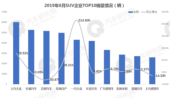 从SUV前十企业销量来看:上汽大众销量为6.01万辆超长城排名首位,同比增长78.52%;长城汽车销量为5.26万辆排名第二,同比微降0.05%%;吉利销量为5.15万辆排第三位,同比降幅最高为-30.87%。一汽大众增幅最高,实现超2倍增长,同比达214.93%,销量为4.30万辆排名第五。