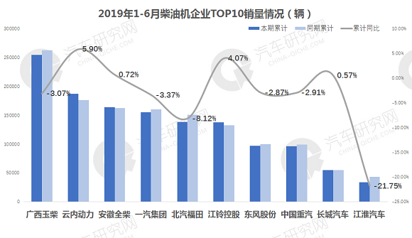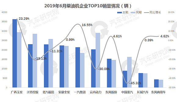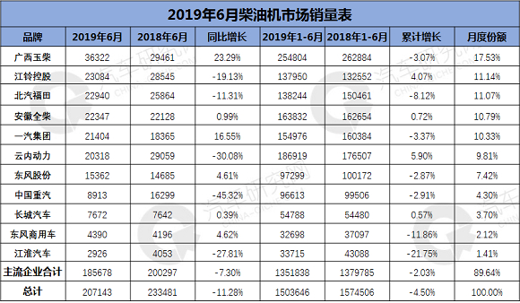 2019年6月柴油机销量:玉柴地位稳固 重汽降幅明显