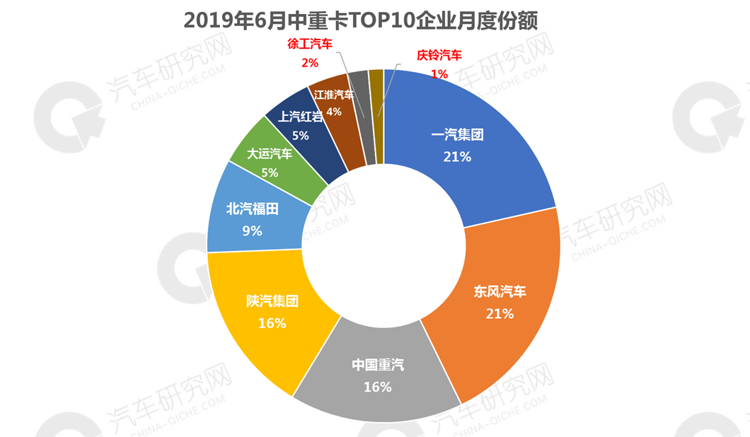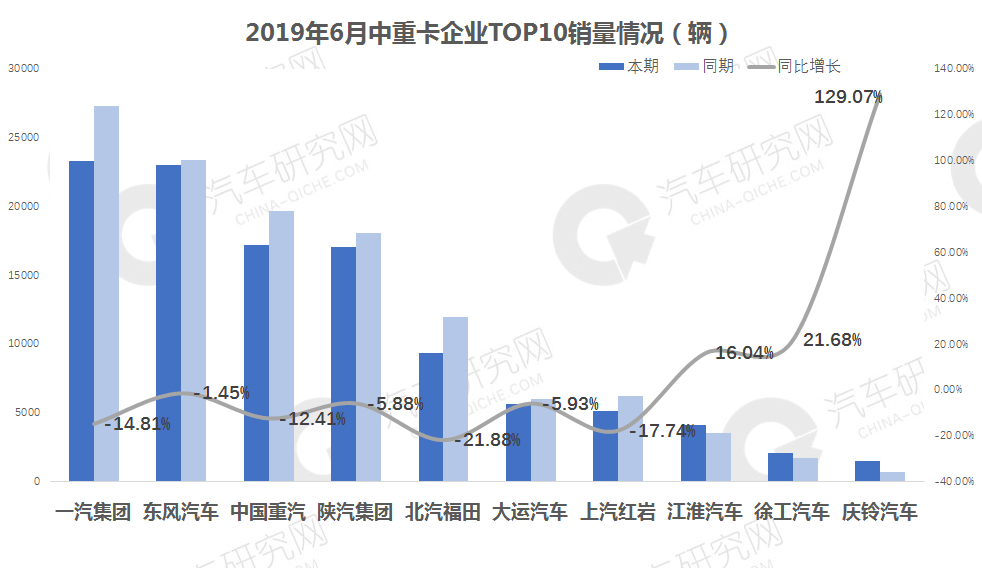 从累计销量排名来看:一汽排名第一位,销量为17.60万辆,同比增长4.27%;东风销量超13万辆排名第二,同比实现微增;江淮累计销量降幅最大,同比下滑18.75%;徐工累计销量增幅近13%,排名第十位。