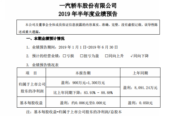 7月13日,一汽轿车股份有限公司发布2019年半年度业绩预告 ,公告显示截止到2019年6月30日,一汽轿车股份有限公司归属于上市公司股东的净利润为900万元-1300万元,比上年同期下降83.93%-88.88%。