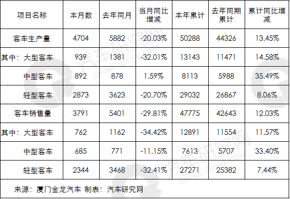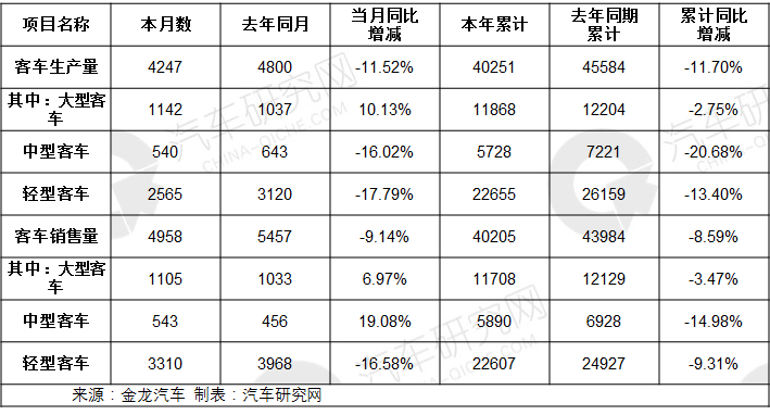 金龙汽车9月客车销售量4958辆 同比下降9.14%
