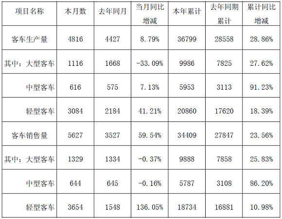 其中中型客车9月销售543辆,同比增长19.08%;1-9月累计销售5890辆,同比下降14.98%。