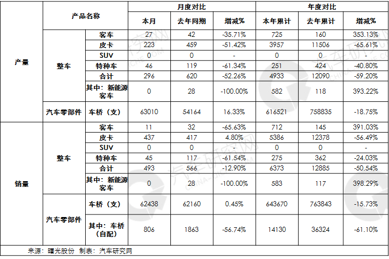 10月10日,曙光股份发布9月产销快报。数据显示,曙光股份9月整车产量为296辆,同比下降52.26%;1-9月整车产量总计4933辆,同比下降59.20%。9月车桥产量为63010支,同比增长16.33%;1-9月累计产量为616521支,同比下降18.75%。