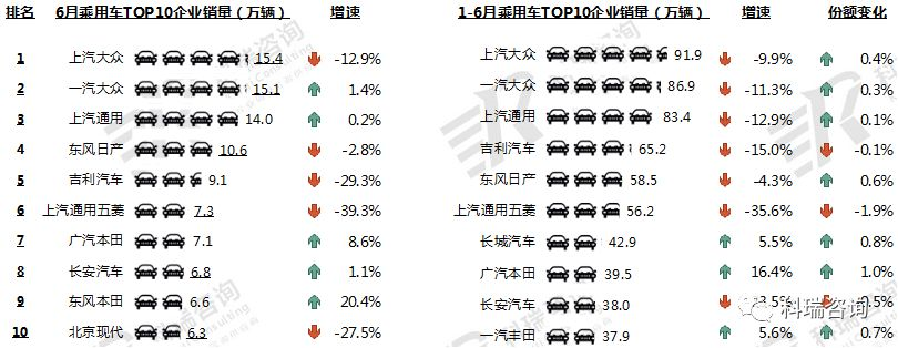 6月,TOP10乘用车企业销量五升五降。上汽大众、一汽大众销量位居前两位,销量超过15万辆;上汽通用五菱、吉利汽车、北京现代降幅在20%以上;东风本田增幅最大为20.4%。