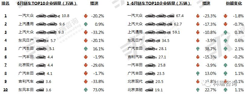 1-6月,TOP10轿车企业累计销量三升七降。一汽大众销量居首,但降幅最大;广汽本田大幅增长38.7%,份额增长2.1个百分点。