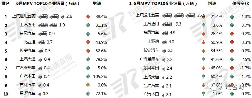 1-6月,TOP10 MPV企业累计销量四升六降;广汽乘用车、上汽大通实现快速增长;比亚迪、东风本田降幅较大在50%左右;上汽通用份额增长较多超过3个百分点。