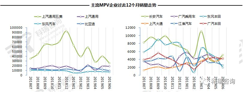 6月,TOP10 MPV企业销量六升三降一平;上汽通用五菱销量依旧位居榜首,同比大幅下降38.4%;长安汽车降幅最大超50%;上汽大通、广汽本田、昌河汽车增幅较大。