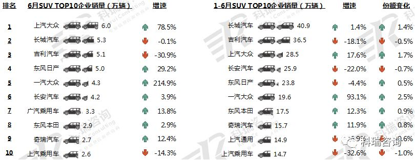 6月,TOP10 SUV企业销量七升三降。上汽大众以6万销量位居首位,大幅增长78.5%;一汽大众表现强势,增幅超过200%;吉利汽车降幅最大为30.9%。