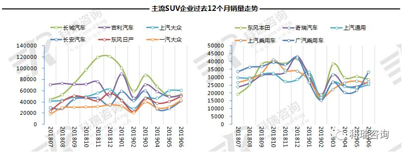 1-6月,TOP10 SUV累计销量五升五降。长城汽车稳居首位,销量突破40万辆,同比微增1.4%。一汽大众增速与份额增长均处于领先;上汽通用和上汽乘用车降幅较大在30%左右。