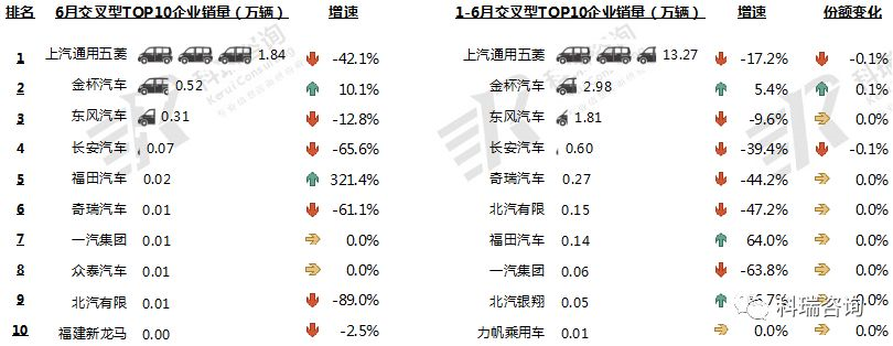 1-6月,TOP10交叉型企业累计销量三升六降一平。上汽通用五菱累计销售13.3万辆,占据65%以上市场份额;金杯汽车位居第二,同比增长5.4%。