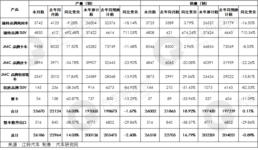 轻卡销7642辆增31% 江铃发布8月销量数据