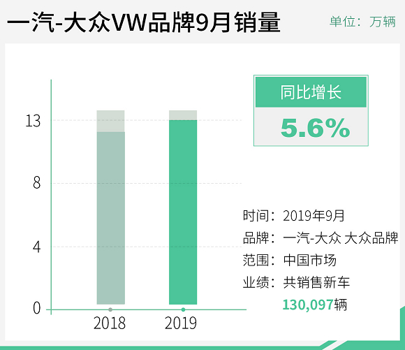 同比增长5.6% 一汽-大众大众品牌9月销量13万辆