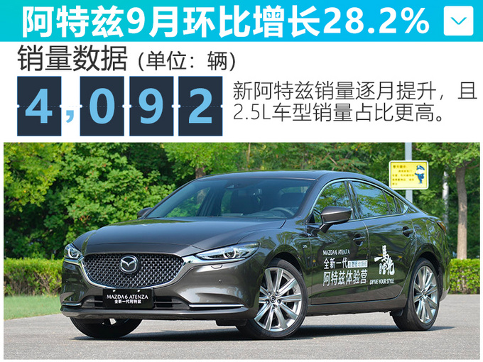 具体车型方面,8月20日上市的阿特兹是一汽马自达的“明星车型”,9月是该车第一个销售完整月,就取得了4,092辆的成绩,环比增长28.2%。该车应用马自达最新设计和最新技术,使整车全面革新,尤其在内饰上大面积的使用奥司维面料、进口北海道栓木、Nappa真皮等,提升了内饰质感,并且更多用户会选择2.5L车型的中高配版,产品品质进一步得到认可。