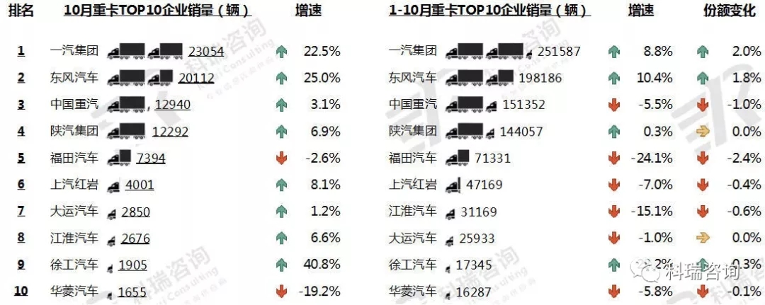 1-10月,TOP10重卡企业累计销量四升六降。一汽集团、东风汽车、中国重汽销量均超15万辆;徐工汽车保持快速增长,增幅超过20%;福田汽车降幅最大,达到24.1%。
