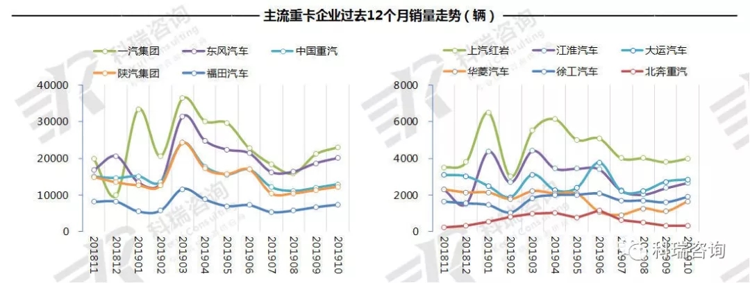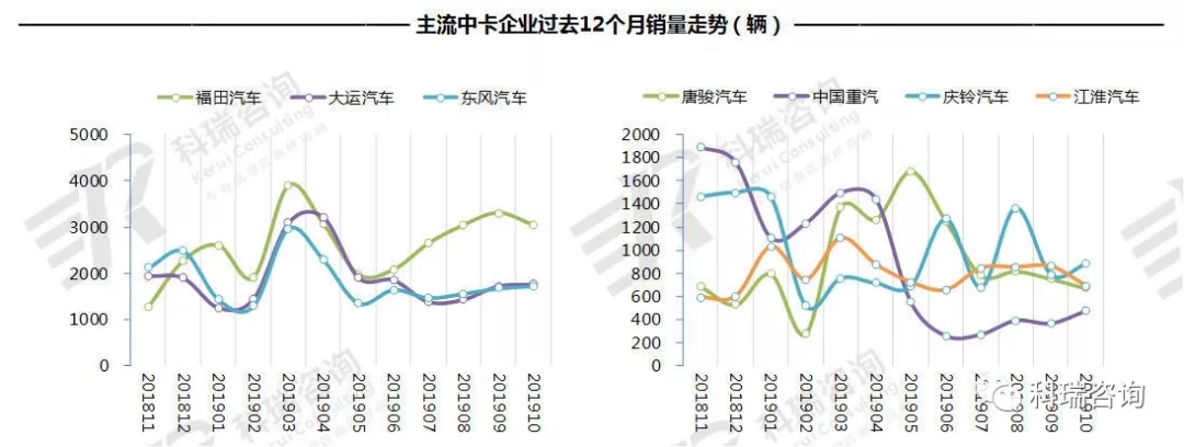 10月,重卡继续保持较好的增长势头,一方面国家基建投资力度的加大,以及车辆更新淘汰、治超等政策的加快落地是重卡连续增长的主要因素,另一方面煤炭运输、散杂运输、绿通等细分市场终端需求回升也进一步提升了重卡行业景气度,10月中旬环保部等部门联合下发《京津冀及周边地区2019-2020年秋冬季大气污染综合治理攻坚行动方案》中再次强调加快淘汰国三柴油车,利好年底的重卡销售。中卡销量在“大吨小标”的影响下获得了较多市场机会,下滑趋势得到一定缓解。