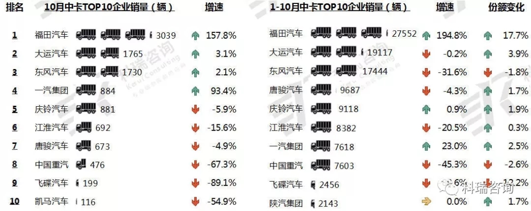 1-10月,TOP10中卡企业累计销量三升六降一平。福田汽车位居榜首,增长接近200%,同时市场份额大幅提高17.7个百分点;飞碟下滑最大,达到88.6%。