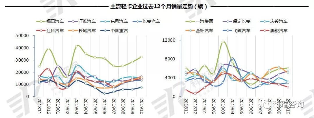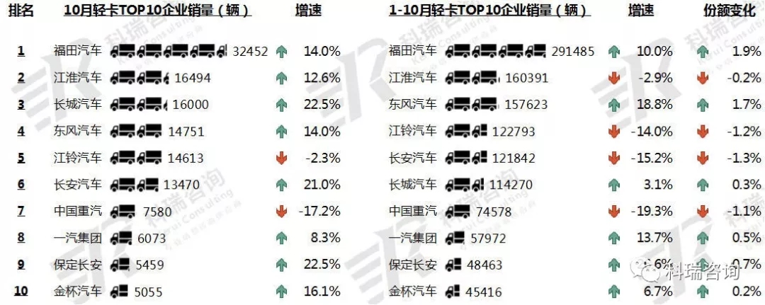10月,TOP10轻卡企业销量八升二降。福田汽车位居首位,同比增长14%;长城汽车、长安汽车、保定长安增幅较大,超过20%;中国重汽降幅最大,为17.2%。