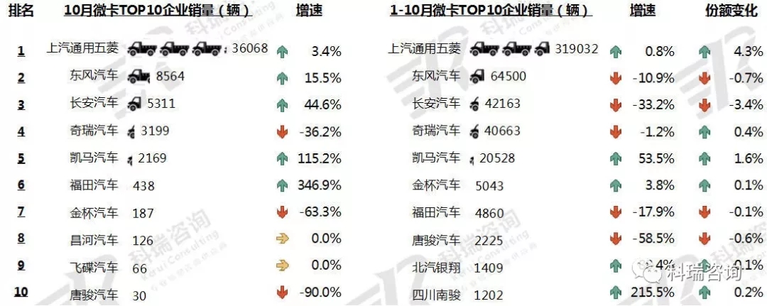1-10月,TOP10微卡企业累计销量五升五降。上汽通用五菱累计销售超30万辆,遥遥领先,市场份额提高4.3个百分点;四川南骏因基数低销量大增;凯马汽车、北汽银翔呈现快速增长;长安汽车、唐骏汽车销量大幅下滑。