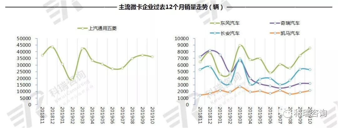 10月,TOP10微卡企业销量五升三降两平。上汽通用五菱销售3.6万辆稳居首位,同比增长3.4%,其他企业销量均未过万;凯马汽车、福田汽车大幅增长;奇瑞汽车、金杯汽车下滑严重。