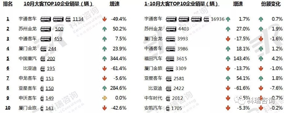 10月,TOP10中客企业销量四升六降;宇通客车仍排名首位,但同比下降超过30%;安凯汽车增幅相对较大,中通客车同比下滑超过50%。