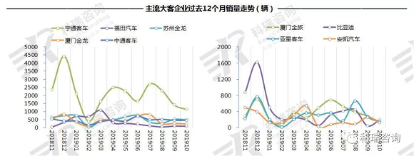 由于新能源公交车的过渡期补贴政策,导致市场需求提前释放,订单集中在6月和7月,8月7日新能源公交车过渡期结束,新能源客车销量开始大幅下滑。经过8、9两月的大幅调整,10月市场已趋于缓和,大客市场出现回升。