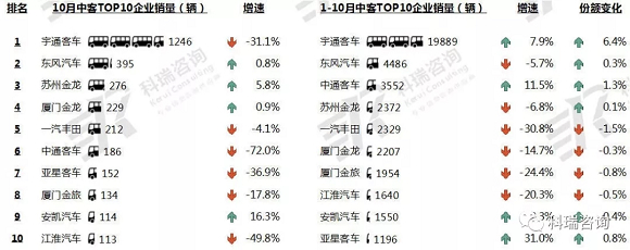 1-10月,TOP10中企业累计销量四升六降。宇通客车累计销售2万辆,同比增长7.9%,市场份额提高6.4个百分点;亚星客车增长最大,达到31%,市场份额上升0.8个百分点;一汽丰田、厦门金旅、江淮汽车下滑较大,超过20%。
