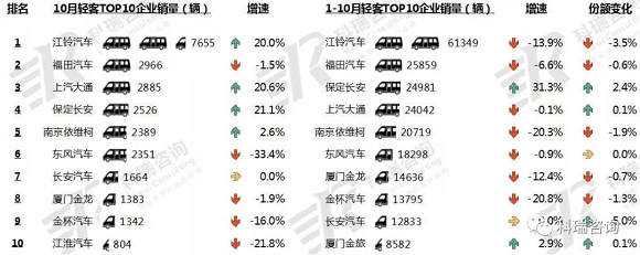 1-10月,TOP10轻客企业累计销售二升七降一平。江铃汽车遥遥领先,累计销售超过6万辆,但市场份额下降3.5个百分点;南京依维柯、金杯汽车降幅较大,超过20%。
