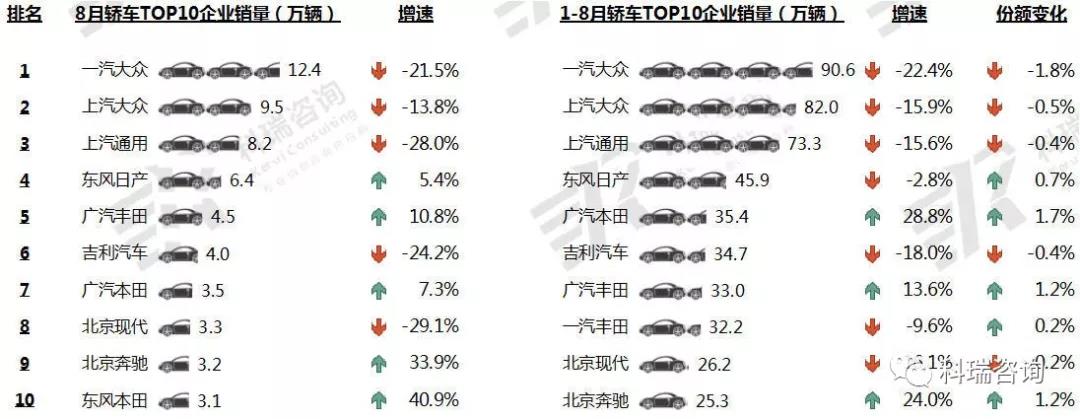 1-8月,TOP10轿车企业累计销量三升七降。一汽大众销量居首,但降幅最大;广汽本田大幅增长28.8%,份额增长1.7个百分点。