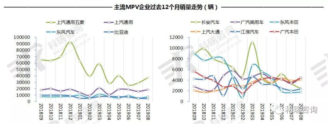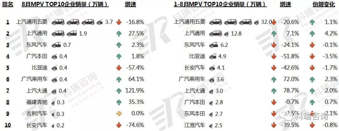 1-8月,TOP10 MPV企业累计销量三升七降;广汽乘用车、上汽大通实现快速增长;比亚迪、东风本田降幅达到50%以上;上汽通用份额增长较多达到4.2个百分点。
