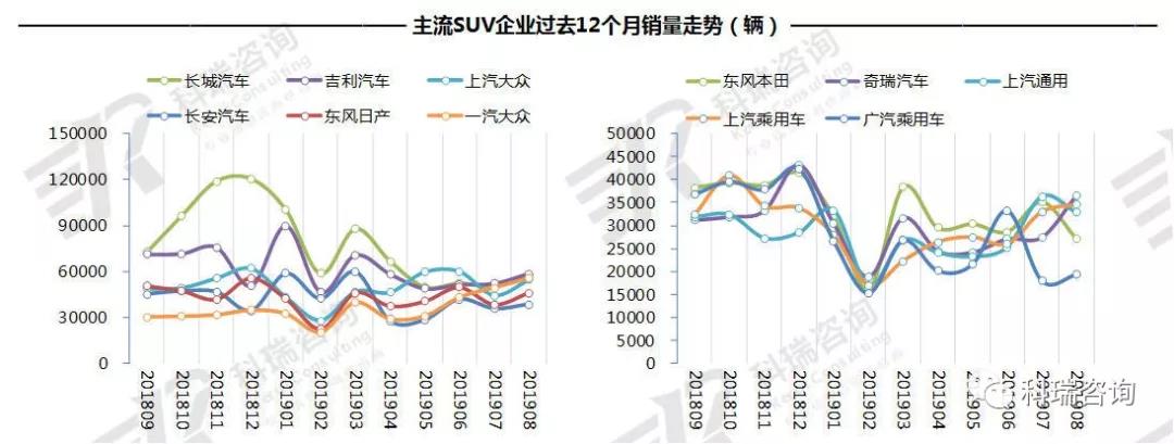 1-8月,TOP10 SUV累计销量六升四降。长城汽车稳居首位,销量突破50万辆,同比增长3.2%。一汽大众增速与份额增长均处于领先;吉利汽车和上汽乘用车降幅较大,在20%上下。