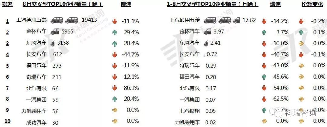 1-8月,TOP10交叉型企业累计销量三升六降一平。上汽通用五菱累计销售17.6万辆,占据65%以上市场份额;金杯汽车位居第二,同比微增。