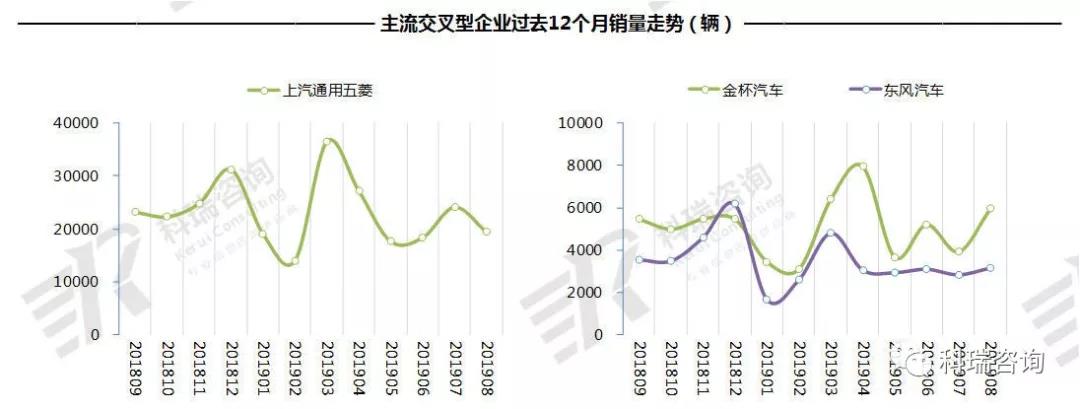 8月,TOP10交叉型企业销量三升五降二平。上汽通用五菱销售1.9万辆,同比下降11.1%。金杯汽车增幅最大,接近30%。
