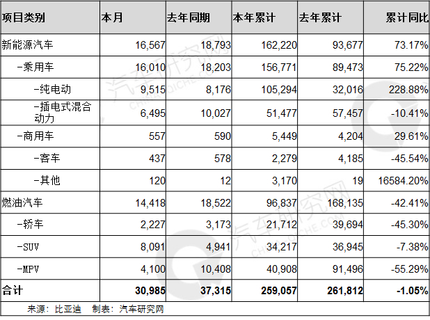 比亚迪公布了10月份销量数据,网通社从其官方获悉:企业10月份销售新车41,130辆,同比下降15.19%。其中,新能源乘用车的销量为12,042辆,同比下滑53.8%;燃油车的销量为28,563辆,同比增长37.12%。 [详细]