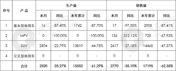 11月份汽车产量为2663辆,同比增长9.45%,汽车销量为2364辆,同比下滑10.22%。1-11月份汽车产量为24226辆,同比下滑57.39%,汽车销量为25610辆,同比下滑58.95%。 [详细]