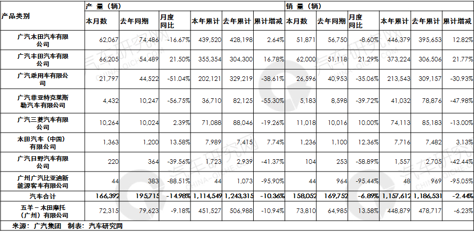 广汽丰田汽车有限公司产量累计同比去年增加16.78%,销量累计同比去年增加21.77%。