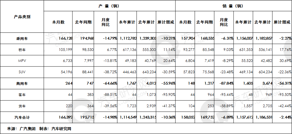 广汽乘用车有限公司产量累计同比去年增加-38.61%,销量累计同比去年增加-30.93%。