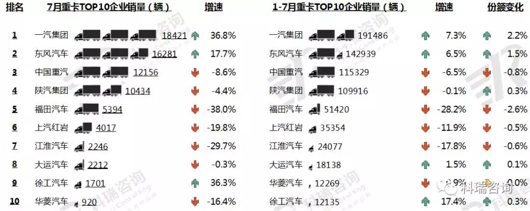 1-7月,TOP10重卡企业累计销量四升六降。一汽集团、东风汽车、中国重汽继续领跑前三,均超10万辆,其中一汽和东风同比小幅增长,重汽同比下降6.5%;福田汽车销量与市场份额下降均为最大。