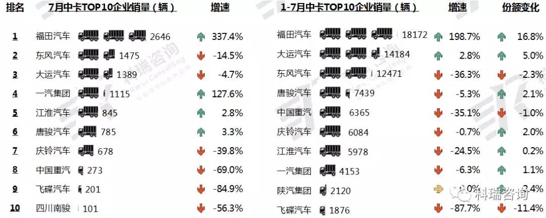 7月,TOP10中卡企业销量四升六降。福田汽车位居首位,销量大幅增长337.4%;一汽集团增幅超100%,重汽、飞碟、南骏降幅较大均超50%。