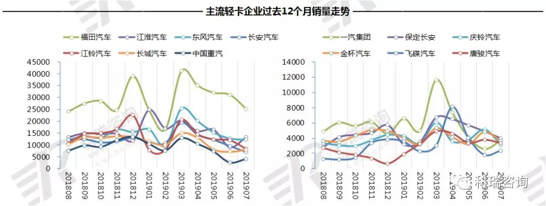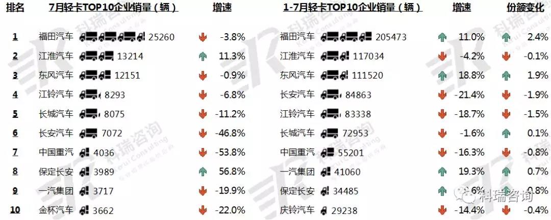 7月,TOP10轻卡企业销量二升八降。福田汽车位居首位,同比下降3.8%;江淮汽车跃居第二,销量增长11.3%;增长最多的是保定长安,达56.8%;中国重汽、长安汽车降幅较大,在50%左右。