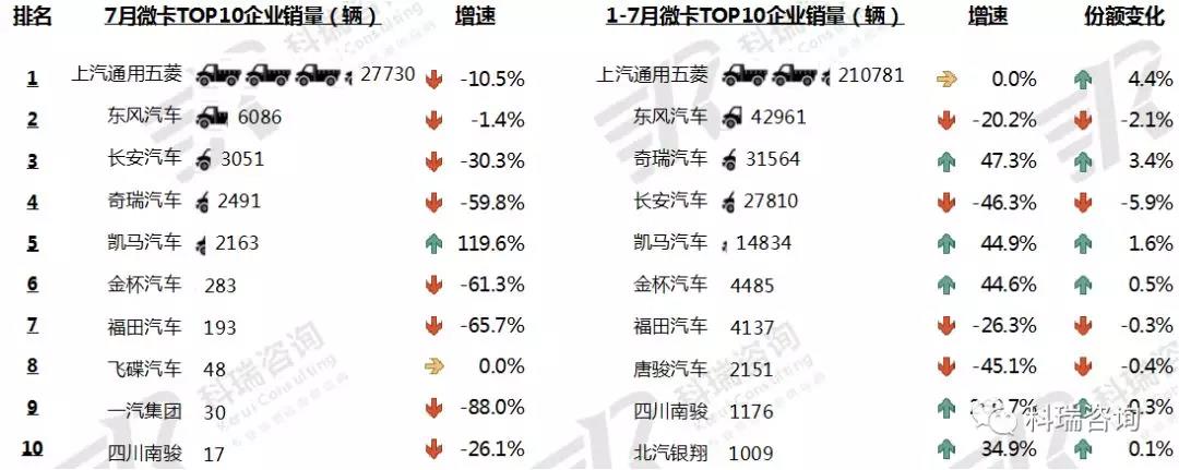 1-7月,TOP10微卡企业累计销量五升四降一平。上汽通用五菱累计销售超21.1万辆,遥遥领先,市场份额提高4.4个百分点。四川南骏因基数低销量大增;奇瑞汽车、凯马汽车、金杯汽车呈现快速增长。