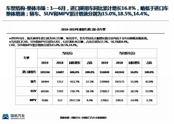从总体来看,1-6月,进口乘用车同比累计增幅16.8%,略低于进口车整体增速;轿车、SUV和MPV累计增速分别为15.0%、18.5%、14.4%。