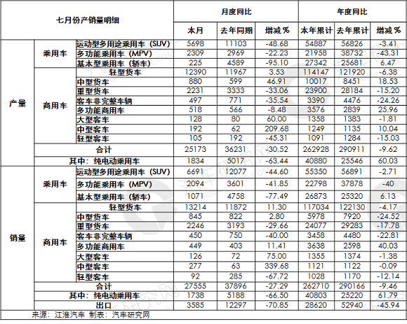 8月7日,安徽江淮汽车集团股份有限公司(以下简称“江淮汽车”)发布2019年7月产销快报。快报显示,江淮汽车7月份销售各类汽车及底盘27555辆,同比下降27.29%;生产各类汽车及底盘25173辆,同比下降30.52%。1-7月,江淮汽车累计销售各类汽车及底盘262710辆,同比下降9.46%;生产各类汽车及底盘262928辆,同比下降9.62%。可以看到,受行业整体车市低迷影响,再加上7月高温购车人比较少,江淮下半年第一个月销量出现下滑,1-7月累计销量降幅为9.46%。