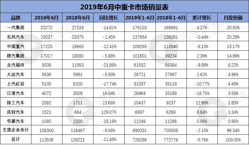 2019年5月中重卡销量:半数企业销量下滑 一汽解放逆